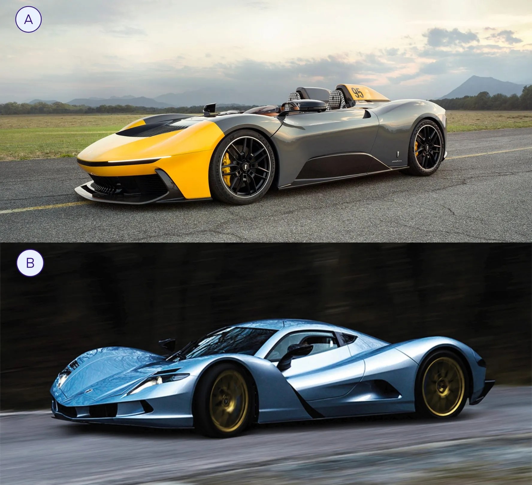 The Automobili Pininfarina B95 is a high-speed, open-top “barchetta”-style sports car, with a 0-to-60 time under two seconds. Meanwhile, the Japanese-designed Aspark Owl is one of the world’s most notorious and fastest electric hypercars, holding the record for the world’s fastest EV until it was recently beaten by a Chinese model.
